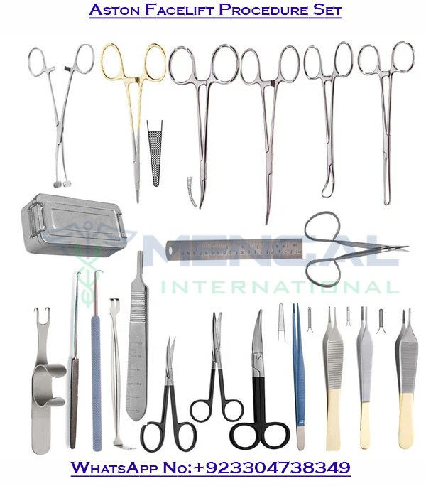 The Aston Facelift Instruments Set is a premium, surgeon-approved collection of facial plastic surgery instruments specifically designed for facelift (rhytidectomy) and advanced facial rejuvenation procedures. Engineered to support the Aston facelift technique, this comprehensive set delivers exceptional precision, controlled dissection, and superior tissue handling, making it an ideal choice for plastic and cosmetic surgeons worldwide.